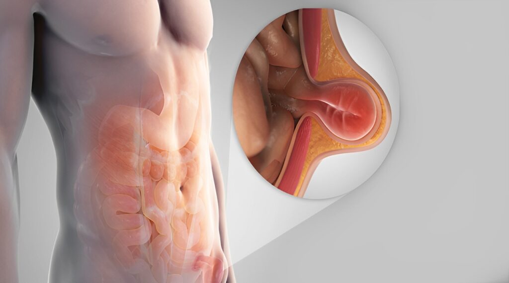 A hérnia é uma abertura ou fraqueza na parede abdominal que permite que parte de um órgão, como o intestino, se projete para fora, formando um “caroço” ou saliência.